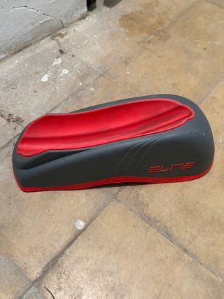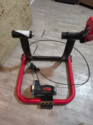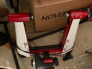 Rodillo de entrenamiento Elite en color blanco y rojo con cubierta como nuevo. - Estructura robusta. - Diseño plegable para fácil almacenamiento. - Incluye accesorios para su montaje. - Incluye cubierta de entrenamiento