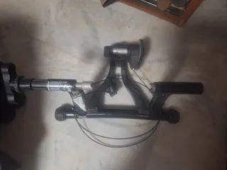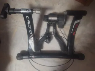 Rodillo magnético para entrenamiento indoor ciclismo o calentamiento previo a alguna prueba. Plegable,tanto el bastidor,como el dispositivo de rodadura. 5 niveles de resistencia,con mando por sirga,adaptable al manillar. En buen estado, pero con marcas de uso. no funciona el selector de velocidad