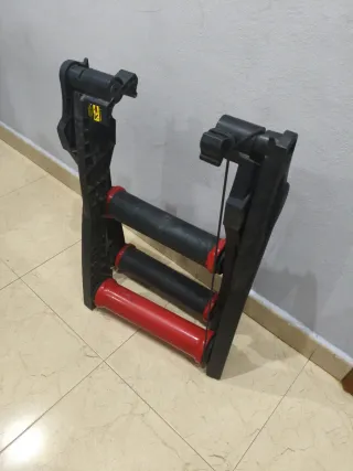 Rodillo de entrenamiento para bicicleta, ideal para mantener la forma física en casa. - Estructura plegable de plástico negro. - Rodillos de goma negra y roja. Uno de los rodillos tiene una grieta pero funciona perfectamente con la cinta que lleva, el otro rodillo solo lo lleva por protección.