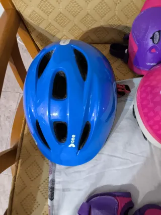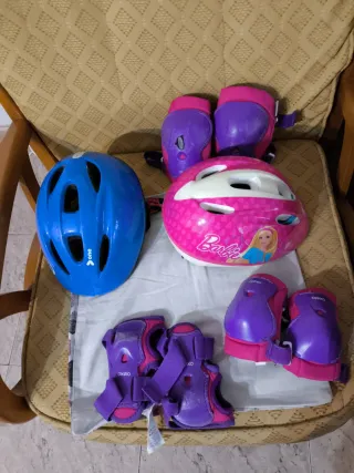 Set de protección para niños y niñas, ideal para patinar o montar en bicicleta. Incluye casco y protecciones para rodillas y codos. - Casco azul 7€ - Casco rosa con diseño de Barbie 12€ con Protecciones rosas y moradas.