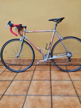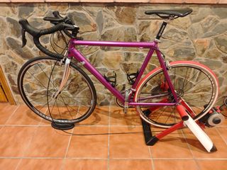 Bici de carretera cuadro de aluminio ligero, usada para rodillo, se le ha puesto nuevo, el sillin, los neumáticos ( los dos de calle), las manetas de cambio, la potencia y cintas de manillar, funciona perfectamente y no hay que hacerle nada, no me interesa cambio. El rodillo no está incluido.