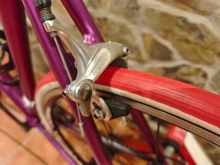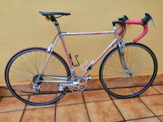 Bicicleta de carretera con un elegante acabado plateado y detalles en rojo. - Cuadro de metal brillante. - Manillar con cinta roja. - Portabidón negro. - montada en campanolo. -ideal para rodillo.