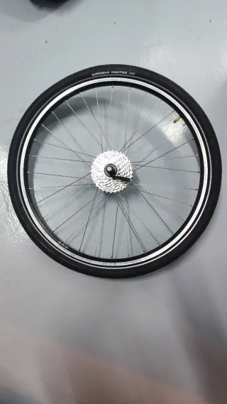 Rueda de bicicleta lista para usar en rodillo. - Llanta de aluminio. - Cubierta Michelin Protek. - Cassette incluido.