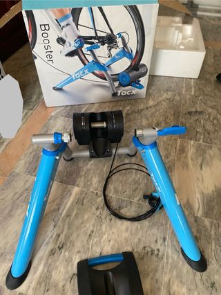 Rodillo Tacx Booster en perfecto estado. (En las fotos puede apreciarse con detalle) Fácil configuración y montaje simple: con tan solo dos simples clics, está listo para usar. Muy estable a pesar del poco espacio que ocupa y facil de mover Su freno magnético te permite aplicar o aligerar la resistencia directamente desde el manillar con pequeña palanca Incluye cubierta para rodillo - Fácil de montar y usar. - Resistencia regulable. - Ideal para entrenamiento en casa