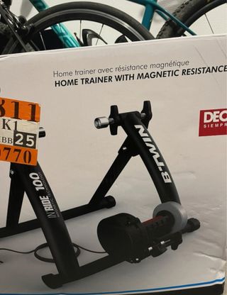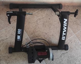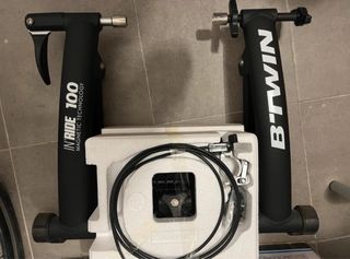 Rodillo de bicicleta B'Twin inRide 100 en perfecto estado. Apenas usado. Rodillo más soporte más neumático liso más camara - Sistema magnético. - Resistencia regulable. - Fácil montaje y almacenamiento. - Incluye manual de instrucciones y accesorios. **PRECIOS** Rodillo: 40 € Soporte: 5 € Neumático y camara: 15€