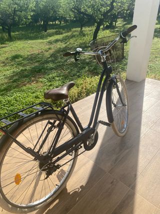 Bicicleta de mujer Elops en color azul. Se encuentra en muy buen estado. - Cesta delantera. - Portabultos trasero. - Sillín marrón.