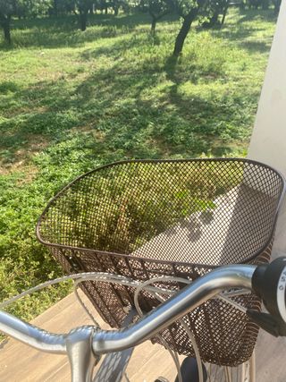 Bicicleta de señora con ruedas de 28 pulgadas y una cesta delantera. - Cesta de mimbre. - Sillín marrón. - Portabultos trasero.