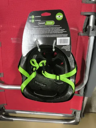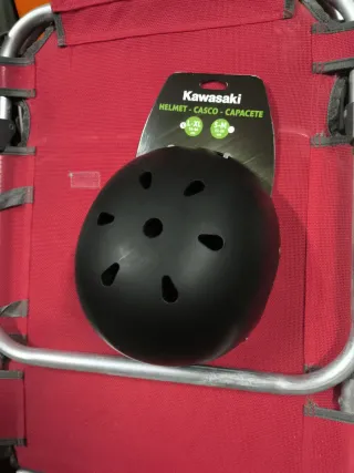 Casco de la marca Kawasaki, ideal para bicicleta o patín. Es un modelo nuevo sin usar. - Color negro. - Talla L-XL (56-60 cm). - Diseño con ventilación.