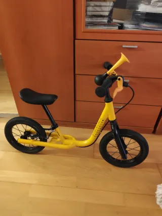 Bicicleta de equilibrio amarilla para niños. - Ruedas de 12 pulgadas. - Sillín negro ajustable. - Manillar con bocina y puños negros. - Freno trasero - Cuadro aluminio