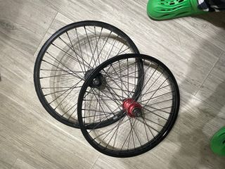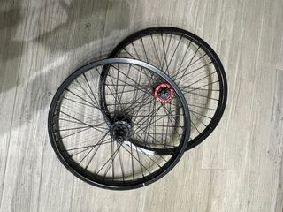 Juego de ruedas para bicicleta BMX. Par de 2 ruedas traseras de bmx, una es mutiny completa (la roja) y la otra es stolen completa de doble capa, la mutiny funciona a la perfección y la stolen habria que ajustar los trinquetes para que funcione bien.
