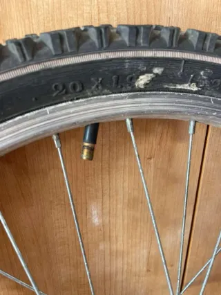Rueda delantera de bicicleta de 20 pulgadas. - Llanta de aluminio. - Cubierta con tacos para mayor agarre. - Radios de acero. - Incluye tuercas y tapones de válvula.