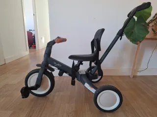Triciclo evolutivo Gyro de Olmitos. Todos los complementos incluídos: palo telescópico, pedales, respaldo, arnés, tapones. En caja y embalaje originales. Se convierte en bicicleta con y sin pedales. Poco uso. - Marco de color gris oscuro. - Asiento negro. - Puños de manillar en color marrón. - Ruedas con aro blanco.