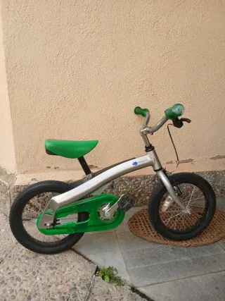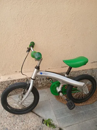 Bicicleta evolutiva de la marca Imaginarium, para aprender a ir en bici. Los pedales y la cadena se desmontan de forma que la bici se puede usar como bici de impulso, para aprender a tener equilibrio. Cuando estan preparados para pasar al siguiente nivel, se le montan los pedales y cadena y se convierte en bici normal, con la que aprenden rápidamente a pedalear. Lleva un freno de mano (rueda trasera) y frena a contrapedal, lo que les va muy bien para controlar el pedaleo y las bajadas. Ruedas de 14 pulgadas. Aprox de 3 a 5 años.