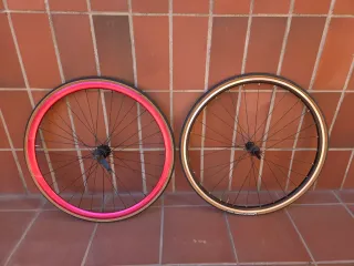 Juego de dos ruedas de 700c para bicicleta. - la rueda trasera tiene buje contrapedal y piñon de 16 fientes. - la rueda delantera tiene cierre rápido y banda de frenado.