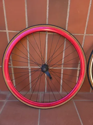 Rueda de bicicleta fixie con freno contrapedal y llanta color personalizado fucsia. - Llanta de aluminio Origin 8 - Radios negros. - Piñón 16t - En perfecto estado. Sin golpes - Incluye neumático. Fixie Fixed gear bicicletas bici bike contrapedal single speed Piñón fijo Origin8 Mavic Weinmann 42mm 30 mm