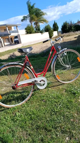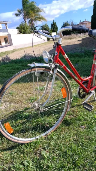 Bicicleta de paseo en color rojo, ideal para desplazamientos urbanos o paseos.esta completa a falta de colocarla al día - Cuadro de bicicleta de paseo. - Ruedas de 28 pulgadas. - Guardabarros delantero y trasero.cambio interior y freno trasero contrapedal - Portaequipajes trasero. - Reflectores naranjas en ruedas y pedales.
