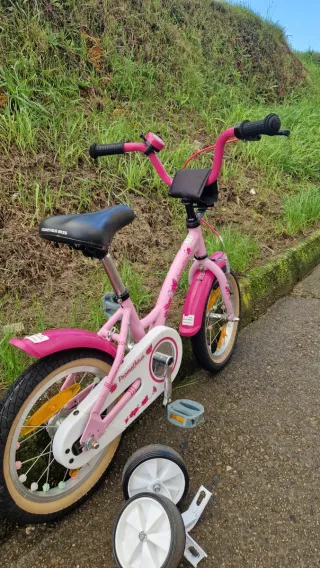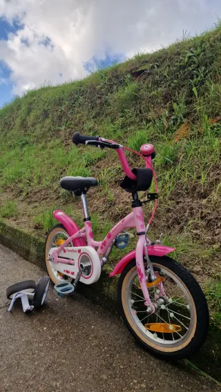 Bicicleta infantil de color rosa con ruedas de 14 pulgadas. - SIN cesta delantera. - Incluye ruedines. SISTEMA DE FRENOS : Freno de contrapedal en la rueda trasera. Freno en V-Brake de aluminio en la rueda delantera. Una necesidad para todas las bici de este tamaño. Dos sistemas de frenado independientes para bicicleta para niños de 4 a 6 años. Tiene signos de uso* ver fotos.