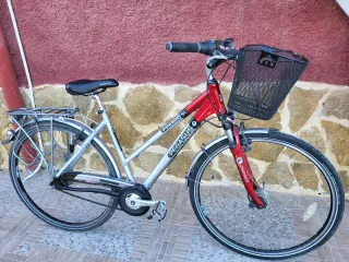 Bicicleta de paseo Pegasus en color plata y rojo, de gran calidad - Cuadro de aluminio. - Ruedas de 28 pulgadas. - Frenos V-brake y freno contrapedal - Cambio Shimano interno - Dinamo interno con luces - Suspensión delantera. - Guardabarro, cesta delantera, pata, portaequipaje, bomba bici.