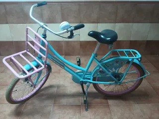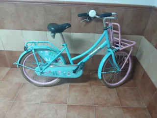 Bicicleta paseo de mujer (niña) en color azul con detalles en rosa. Marca POPAL muy conocida en Holanda. - Cesta delantera rosa. - Guardabarros trasero decorado. - Ruedas con aro rosa. - Timbre blanco. -Freno trasero contrapedal. -Medidas:1,50×90