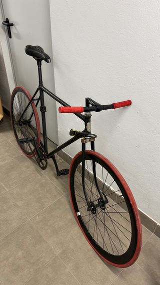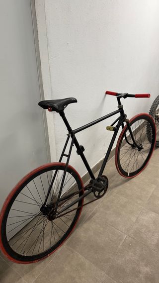 Bicicleta estilo fixie con freno contrapedal. El cuadro es de color negro y las ruedas tienen un distintivo color rojo. - Cuadro negro. - Ruedas con cubierta roja. - Manillar con puños rojos. - silin selle italia. Escucho ofertas.