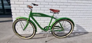 Bicicleta de estilo clásico de la marca HOODBIKES en color verde. - Cuadro de diseño curvo. - Sillín marrón con muelles. - Ruedas con banda blanca. - Guardabarros delantero y trasero. -freno contrapedal. -cambio 3 velocidades en buje trasero.