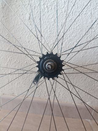 Rueda trasera de bicicleta con freno contrapedal. - Llanta de aluminio. - Radios de acero. - Piñón incluido.