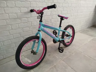 Bicicleta infantil de color azul con detalles en rosa. Ideal para los más pequeños. - Ruedas de 16 pulgadas. - Frenos en manillar y contrapedal. - Incluye ruedines.