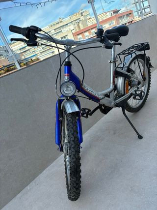 Bicicleta infantil de la marca alemana Pegasus, ideal para los más pequeños. - Color azul y plateado. - Ruedas de 20 pulgadas. - 3 marchas - Incluye luz delantera y trasera (la trasera necesita reparación) - Incluye portabultos trasero. - Guardabarros delantero y trasero. - Pata de cabra. - freno en el manillar y a contrapedal - marca de alta calidad