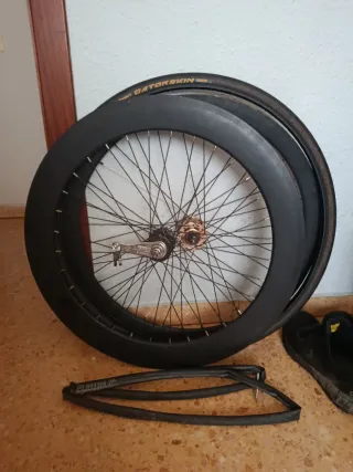 Juego de ruedas para bicicleta fixed Montadas a la carta tipo pista - Aros con perfil negros mate. - Delantera perfil 45mm. - Trasera perfil 70mm. - Buje trasero gurpil contrapedal. - Piñón trasero 18 dientes. Regalo cubierta continental gatorskin 28c