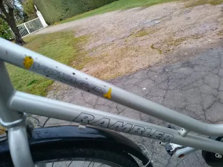 Bicicleta de paseo Rambler, fabricada en EE. UU. Tiene freno trasero contrapedal - Cuadro de color plateado. - Ruedas de 28 pulgadas. - Portaequipajes trasero. - Guardabarros delantero y trasero. -Luces delantera y trasera con dinamo.