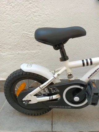 Bicicleta infantil de la marca Prometheus, con un diseño moderno y llamativo. - Color blanco. - Guardabarros trasero. - Cadena protegida. - Rueda delantera con reflectante naranja. - Detalle de águila y líneas decorativas. - freno delantero y trasero a contrapedal. Usada 2 veces. Está nueva.