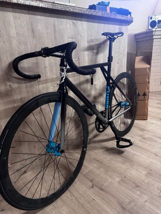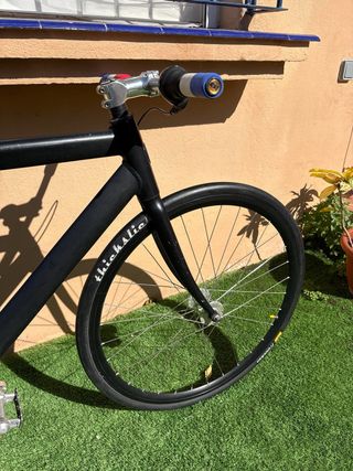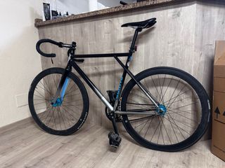Bicicleta con freno contrapedal, no es fixie, con cuadro aluminio, horquilla de carbono y detalles llamativos. Perfecta para ciudad. Algo negociable. Talla M. También añadiría un rueda delantera de radios blanca por si un dia prefieres poner la azul lenticular y otro una rueda normal de radios y cinta nueva verde para el manillar. Prefiero venta en persona por su tamaño, 150€ es muy buen precio,por mudanza la tengo q vender. Venta en persona o Solo envio por correos por su medida.