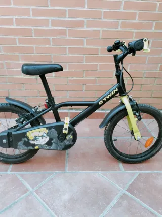 Bicicleta infantil Btwin Dark Hero 500, ideal para los más pequeños. - Diseño llamativo con personaje. - Ruedas de 16 pulgadas. - Frenos de mano y contrapedal. - Guardabarros delantero y trasero, su precio en Decathlon es de 160€, le falta pastilla de freno trasero.