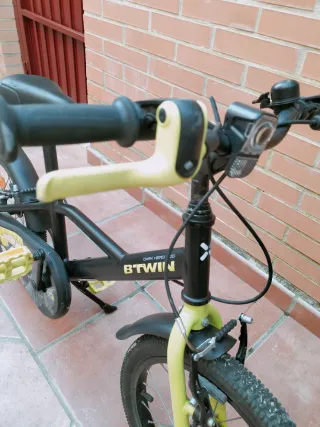 Bicicleta infantil de la marca BTwin en color azul con timbre amarillo. Perfecta para peques de hasta 6 años. - Ruedas de 16 pulgadas. - Freno de mano ajustable y contrapedal. - Sillín y manillar ajustables en altura.