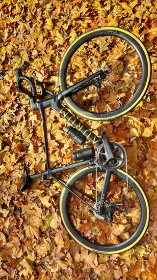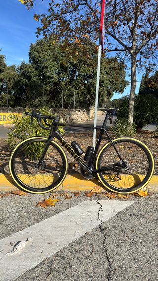 Bicicleta de gravel/cx Canyon Inflite en color amarillo . - Cuadro de carbono - Ruedas nesta tubular y ruedas tubeles dtswiss - Frenos de disco. Buelas carbono sram force Talla S ( canyon talla grande)