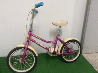 Bicicleta infantil de la marca TOPBIKE, ideal para los más pequeños, por su facil aceso de subir y bajar al llevar la barra inclinada. Las ruedas de estar desinflada y sin usar estan algo agrieteadas, pero aun asi esta nueva pese a sus años. Es una bicicleta de época. - Color morado. - Ruedas de 14 pulgadas. - Guardabarros delantero y trasero. - Puños de manillar en color azul.