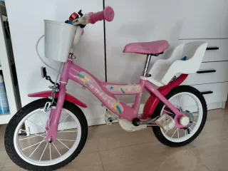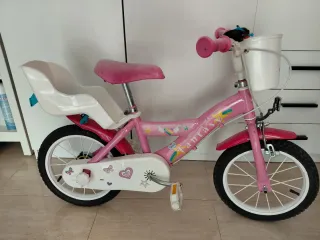 Bicicleta infantil de color rosa, ideal para los más pequeños. - Ruedas de 14 pulgadas. - Sillín ajustable. - Incluye ruedines de apoyo. - Freno delantero y trasero.