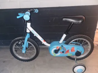 Ruedas de 14 pulgadas. Sillín a 48cm del suelo en su posición más baja, sube hasta 58cm. Para edad entre 4 y 6 años aprox. Se incluyen ruedines que no se ven en la foto. Prácticamente sin uso, como nueva.