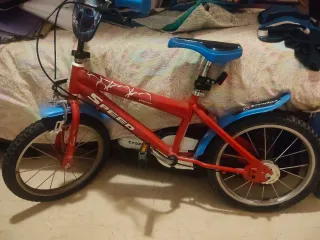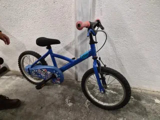 Bicicleta infantil de color azul, ideal para niños de 4 años. - Ruedas de 16 pulgadas en perfecto estado. - Diseño divertido con pegatinas. - Altura ajustable del asiento. - Pedales y frenos delantero y trasero. - Puños en el manillar. La compré al mismo precio en Wallapop poco antes de Reyes y estos trajeron una nueva así que ya no la vamos a usar.