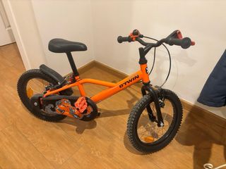Bicicleta infantil de la marca B'TWIN en color naranja. - Ruedas de 16 pulgadas. - Frenos delanteros y traseros. - Sillín ajustable en altura. - Guardabarros delantero y trasero.