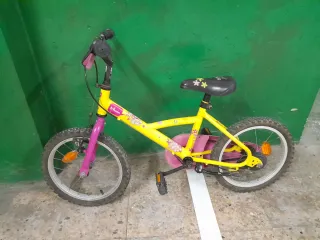 Bicicleta infantil de 16 pulgadas. Marca Btwin, decathlon. Color amarillo y rosa. Color rosa del plástico cubrecadena esta desgastado del sol. Por lo demás esta en buen estado de funcionamiento Edad aproximada de 4 a 7 años - Ruedas de 16 pulgadas. - Cuadro de color amarillo. - Horquilla y detalles en color rosa. - Sillín negro con estampado floral. Recogida por parte del comprador barrio Sant Marti (Barcelona)