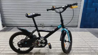 Bicicleta infantil de la marca Decathlon en color pistacho. Ruedas de 16 pulgadas. Frenos delanteros y traseros. - Sillín ajustable. Pedales antideslizantes. Pata de cabra para sostenerla. Si interesase el envío, sin problema pero pesa más de 10kg, osea entre 10 y 20