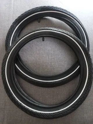 Juego de cubiertas y cámaras para bicicleta de rueda de 16 pulgadas. Listas para instalar. - Diseño con banda reflectante blanca. - Dibujo optimizado para tracción.