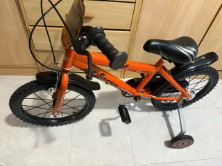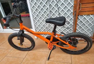 Bicicleta infantil 16" Btwin de color naranja, ideal para los más pequeños. Cuenta con un diseño llamativo y es perfecta para iniciarse en el mundo del ciclismo. En perfecto estado!! - Ruedas de 16 pulgadas. - Frenos de mano. - Cadena protegida. - Pegatinas decorativas en la cadena. -Caballete lateral