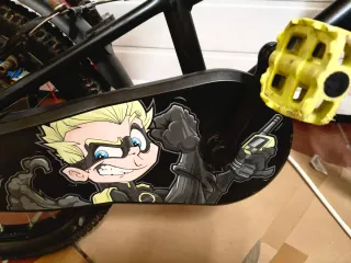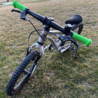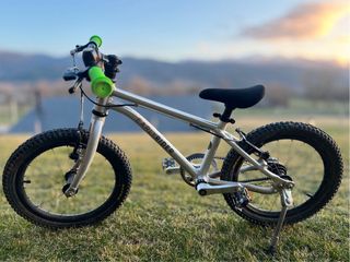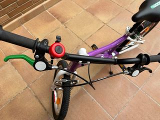Bicicleta ultraligera diseñado para que los más pequeños pasen directamente de la bici sin pedales a esta. Como pesa poco, enseguida pueden ponerla en marcha si necesidad de ruedines. Correa de tracción, no cadena, sin grasa, para que se pueda transportar perfectamente sin manchar nada. Sillín y manguitos comprados recientemente, poco uso, como nuevos. - Cuadro de aluminio ultraligero. - Ruedas de 16 pulgadas con tacos todoterreno. - Frenos de disco. - Sillín con abrazadera para adaptar fácilmente la altura.