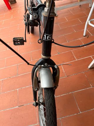 Bicicleta plegable en color negro, con ruedas de 16 pulgadas. - Diseño compacto y fácil de transportar. - Manillar ajustable en altura. - Sillín cómodo. - Guardabarros delantero y trasero. - Portabultos trasero. Bicicleta en buen estado, la compre por wallapop para mi, pero era muy pequeña, le cambie la cubierta y la camara ya que etaban pinchadas, ahora estan perfectas. Tiene el pedal un poco suelto y hace un poco de ruido, habría que cambiar el pedal, y por ultimo el manillar de las marchas no va pero las marchas si. NO ENVIOS