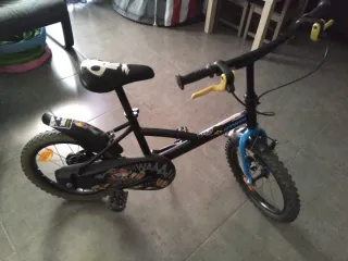 Bicicleta infantil Btwin en color negro y azul. - Ruedas de 16 pulgadas. - Ruedines aprendizaje incluidos. - Sillín ajustable. - Guardabarros delantero y trasero. - Puños de goma para un mejor agarre.