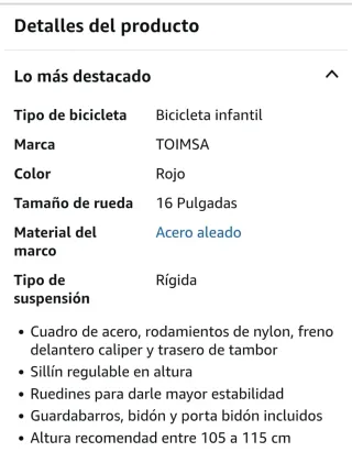 Bicicleta infantil de color rojo, ideal para los más pequeños. - Ruedas de 16 pulgadas. - Frenos delanteros y traseros. - Sillín ajustable en altura. - Guardabarros delantero y trasero.