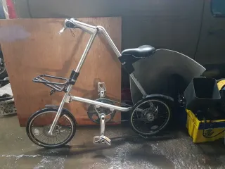 Bicicleta plegable Strida 5.0, ideal para desplazamientos urbanos. Su diseño único permite un plegado rápido y compacto. - Marco de aluminio plateado. - Ruedas de 16 pulgadas. - Frenos de disco. - Sillín ajustable.