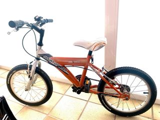 Bicicleta infantil de la marca Btwin, ideal para los más pequeños. Su llamativo color naranja la hace muy visible. - Ruedas de 16 pulgadas. - Incluye cesta delantera. - Diseño con guardabarros. de 4-6 años bastante buen estado